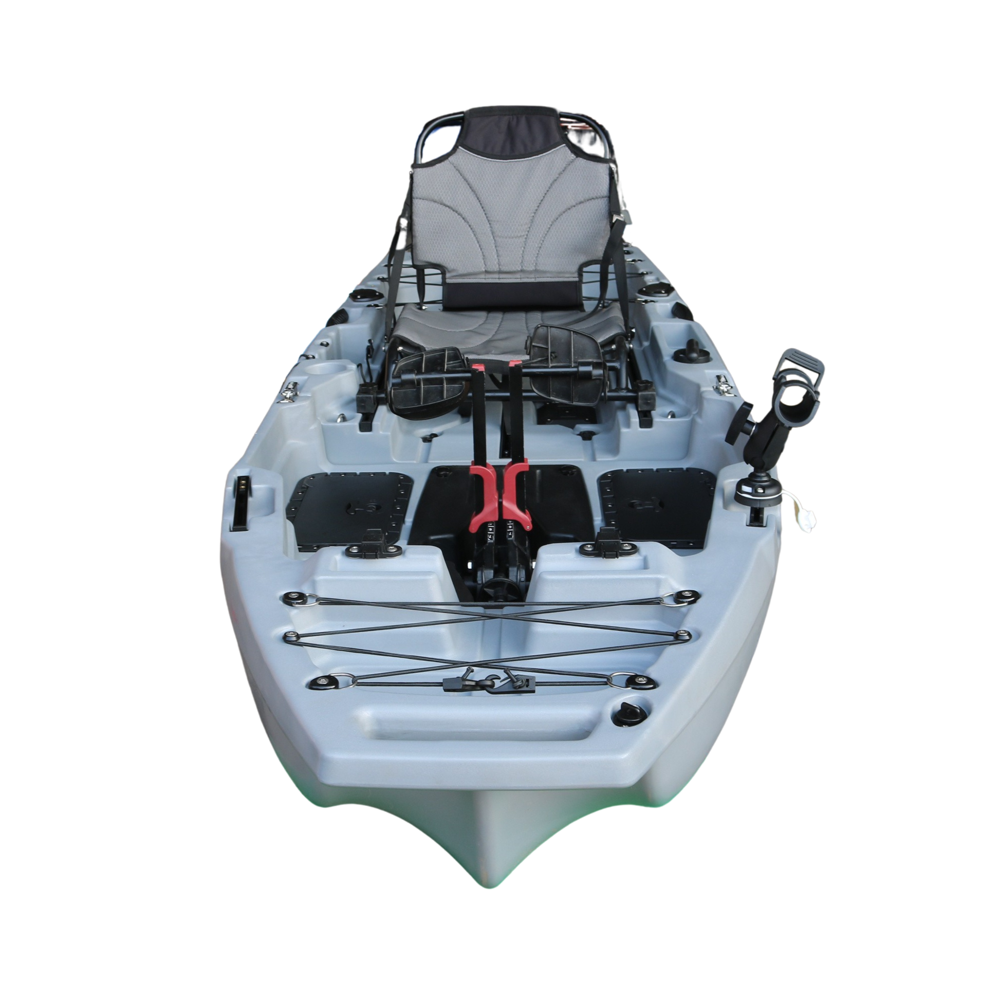 6 scupper plugs, 1 drainage plug, 2 side carry handles, front/back toggle carry handles, 2 flush fishing rod holders, 2 rectangle storage hatch, 2 side h-tracks, 1 adjustable fishing rod holder, rear bungee storage area, 2 paddle straps, 1 fish finder hole, 1 full rudder system, 1 double-ended paddle, 1 comfortable aluminum frame seat, 1 pedal drive system surrounded by a black foot mat.